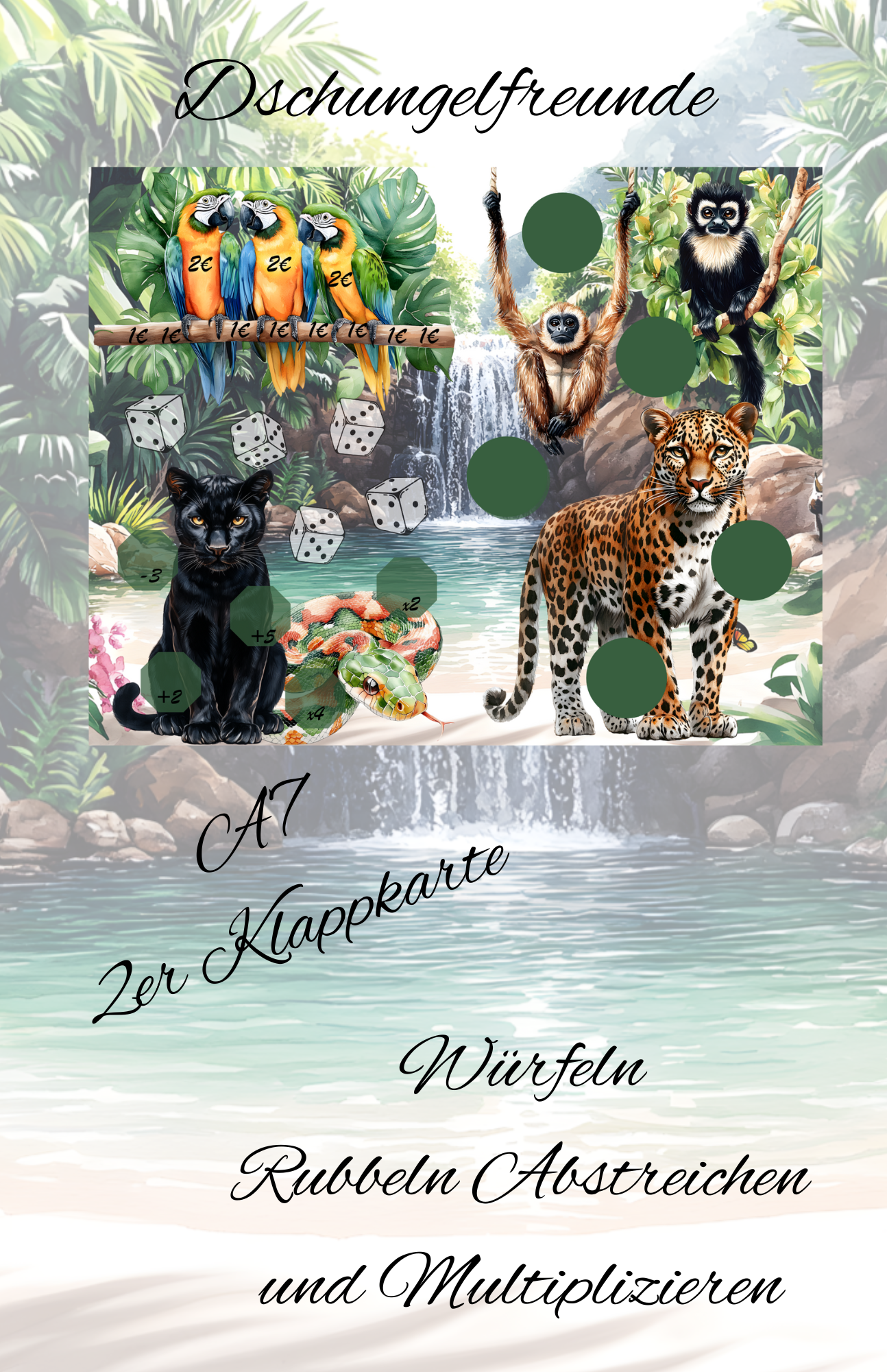 Dschungelfreunde A7 Klappkarte zum Rubbeln würfeln abstreichen und multiplizieren.