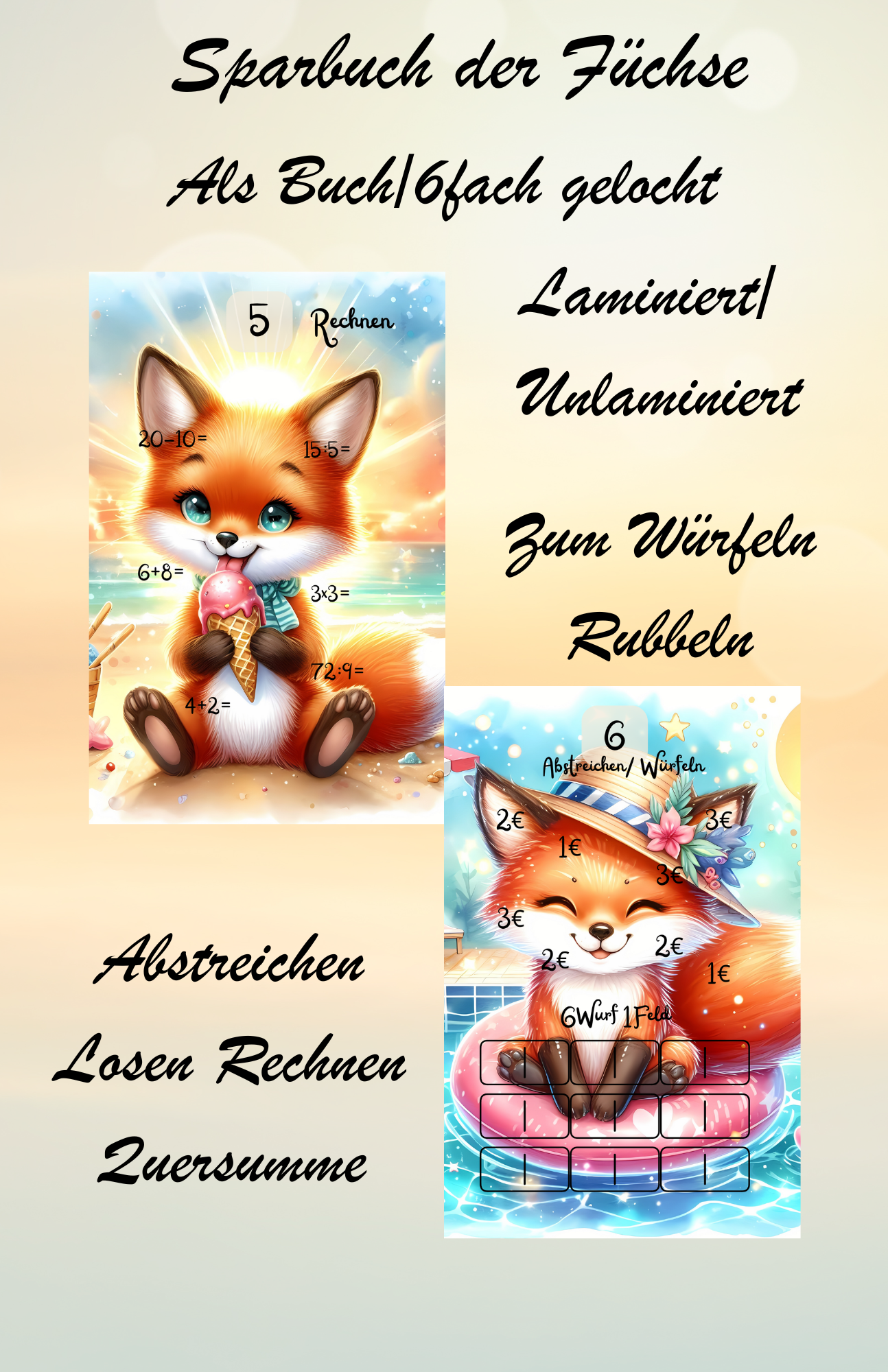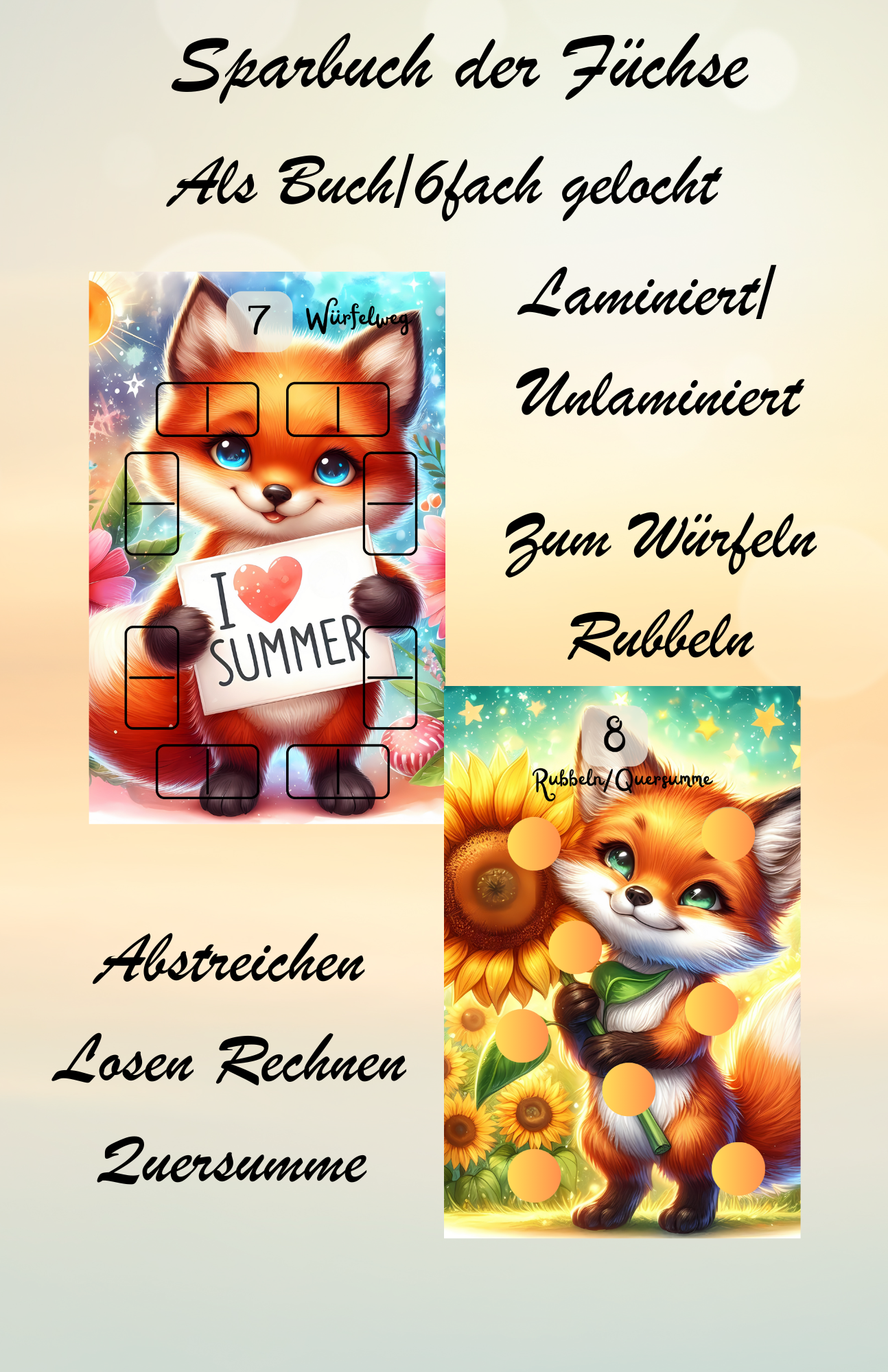 Sparbuch der Füchse für Füchse Liebhaber zum Rubbeln Losen Würfeln Quersumme sparen.