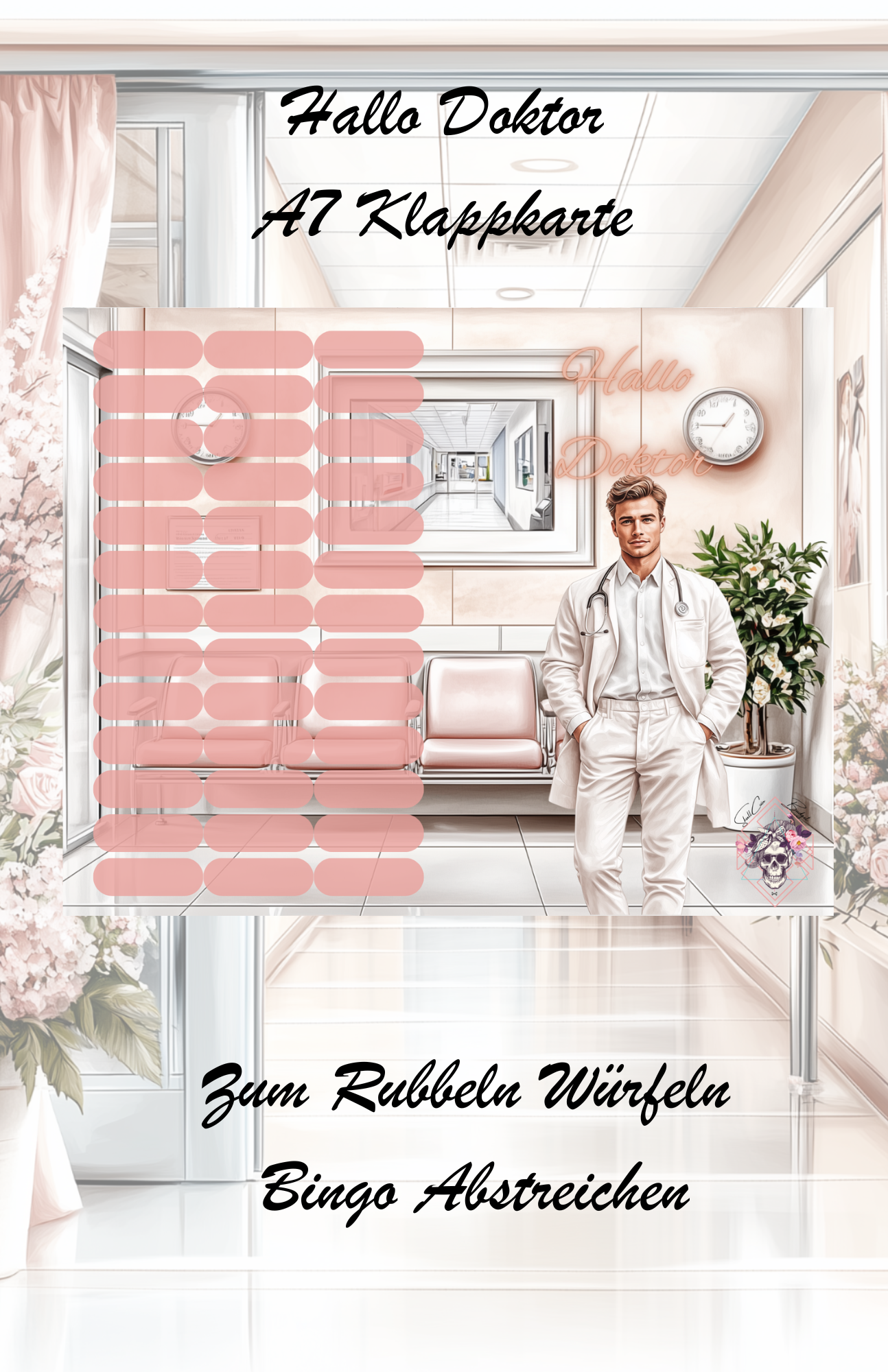 Hallo Doktor eine A7 Klappkarte zum rubbeln würfeln abstreichen und einem 4x4 Bingo.
