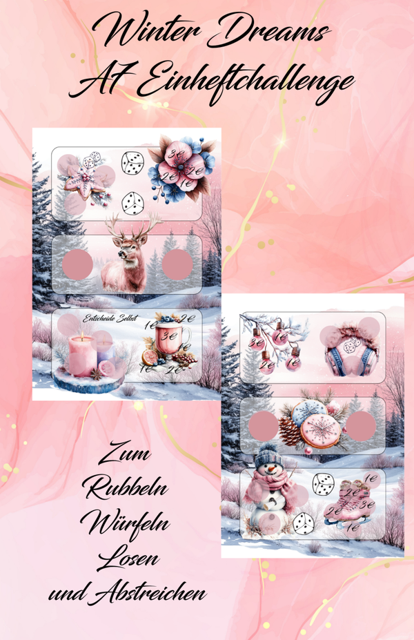 Winter Dreams eine kleine A7 Challenge zum einheften zum rubbeln würfeln losen und abstreichen.