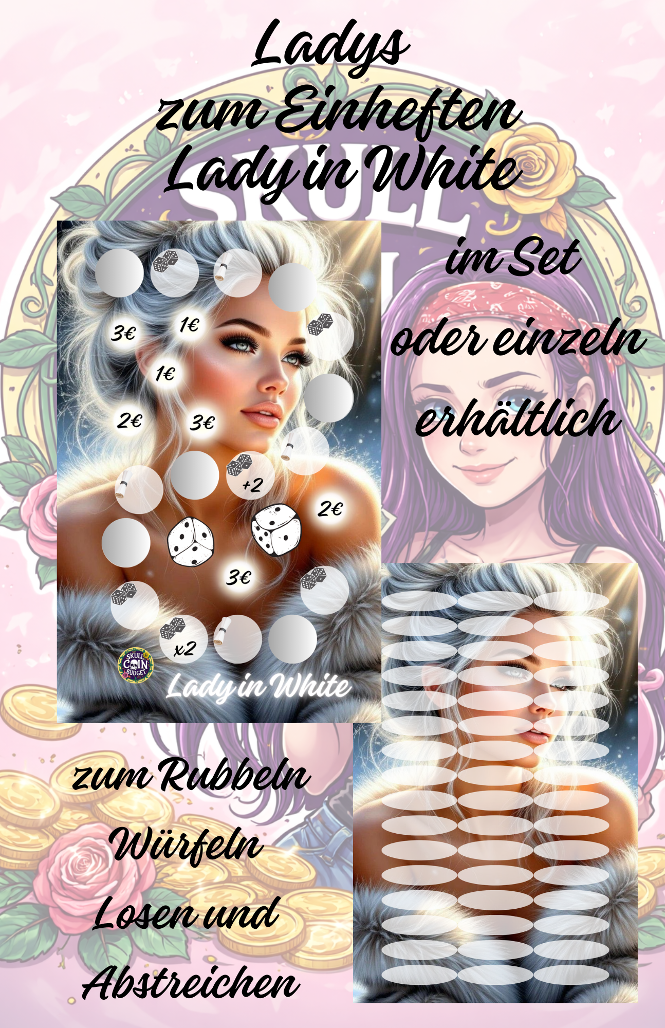 Lady in White zum rubbeln losen würfeln und abstreichen